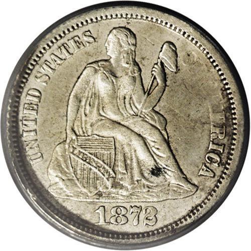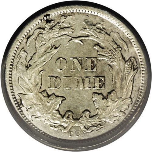 <B>1872-CC<10C>--Improperly Cleaned--NCS. AU Details.</B></I> A tough Seated dime date, exacerbated by the fact that most pieces known come with problems. Hairlining in the fields confirms the NCS designation, yet the level of detail remaining on this coin appears to be inadequately described by the grade; indeed, there appears to be only a trace of actual wear evident. Breen states about this date, "always weakly and unevenly struck." OF AMER is very weak and practically obliterated, and the denomination is uneven, yet most of the remaining detail is fully brought up. The overall appearance is by no means displeasing, and the high quality of evident details should ensure that this coin finds a happy buyer.