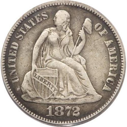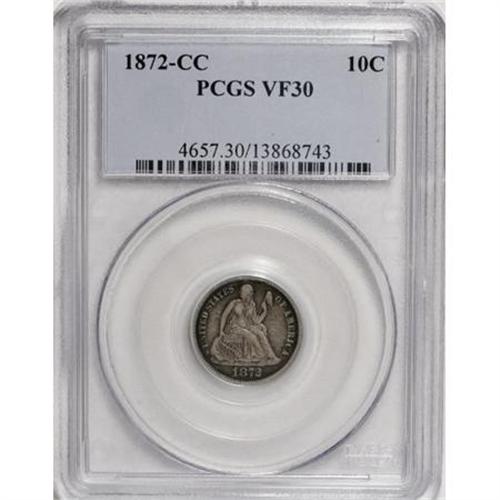 <B>1872-CC 10C VF30 PCGS.</B></I> A textbook example of the grade, with light gray fields and darker charcoal tones in the protected areas, amplifying the remaining details. With an impressively low mintage of only 35,480 pieces, this issue is understandably scarce. A bit of roughness is noted on the reverse at 2 o'clock, but there are no other deviations from what one would expect. Census: 10 in 30, 8 finer (11/07).<BR><BR><B>Coin Engraver:</B> Christian Gobrecht<BR><BR><b>Shipping:</b> Coins & Currency (<a target="_blank" href="http://www.heritageauctions.com/common/shipping.php">view shipping information</a>)