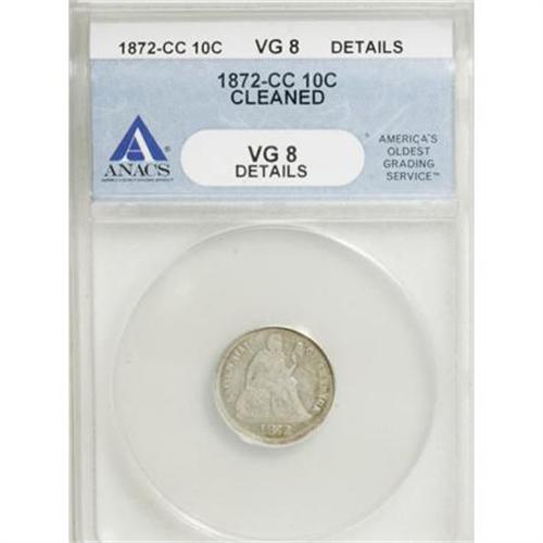 <B>1872-CC 10C --Cleaned--ANACS. VG8 Details.</B></I> A scarce Seated dime with an impressively low mintage of only 35,480 pieces. Fine hairlines are visible on silver-gray surfaces that display traces of gold-tan on the reverse. LIBER shows, as does part of the T. Some small abrasions occur over each side.<BR><I>From The John Stimson, Sr. Collection, Part Two.</B></I><BR><BR><B>Coin Engraver:</B> Christian Gobrecht<BR><BR><b>Shipping:</b> Coins & Currency (<a target="_blank" href="http://www.heritageauctions.com/common/shipping.php">view shipping information</a>)