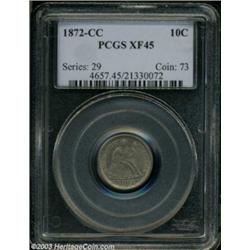 <table><tr><td><TABLE cellSpacing=0 cellPadding=0 width="100%" bgColor=#000000 border=0><TBODY> <TR><TD width="100%"><TABLE cellSpacing=1 cellPadding=3 width="100%" border=0><TBODY><TR><TD width="100%" bgColor=#79735c><FONT face=arial color=#ffffff size=3><B>Description</B> </FONT></TD></TR><TR><TD width="100%" bgColor=#ffffff><FONT face=arial size=2><B>1872-CC 10C XF45 PCGS.</B></I> This example represents one of the scarcest of all Seated Liberty dimes, with a mintage of only 35,480 pieces, most of which saw extensive circulation. Breen notes that this date is "Always weakly and unevenly struck. Usually in low grades, prohibitively rare EF." Well struck (for the issue), there are only a few visible impairments on the obverse fields, just one pinpoint-sized mark near the reverse center, and a moderate layer of original, mostly gray color over each side. The features are very lightly worn, considering the assigned grade. Population: 3 in 45, 2 finer (9/03). </FONT></TD></TR></TBODY></TABLE></TD></TR></TBODY></TABLE><BR><A name=PricesRealized></A><TABLE cellSpacing=0 cellPadding=0 width="100%" bgColor=#000000 border=0><TBODY><TR><TD width="100%"><TABLE cellSpacing=1 cellPadding=3 width="100%" border=0><TBODY><TR><TD width="100%" bgColor=#79735c><A name=PR><FONT face=arial color=#ffffff size=3><B>Previous Prices from Heritage Auctions</B> </FONT></A></TD></TR><TR><TD bgColor=#f6f6ed><TABLE cellSpacing=0 cellPadding=0 width="100%" border=1><TBODY><TR><TD align=middle width="33%"><B>Date</B></TD><TD align=middle width="33%"><B>Service</B></TD><TD align=middle width="33%"><B>Price</B></TD></TR><TR bgColor=whitesmoke><TD width="33%"><B>01/01/1997</B></TD><TD width="33%">PCGS</TD><TD width="33%">$4,400.00</TD></TR></TBODY></TABLE></TD></TR><TR><TD bgColor=#ffffff><FONT face=arial size=1 ?>PLEASE NOTE: All prices realized reflect the final hammer price PLUS the buyer's premium in auctions that charge a buyer's premium. Each item has a notation at the top of the listing indicating whether that lot included a buyer's premium. Example: A item that sells with a final hammer price of $100 and a 20% buyer's premium will display with a price realized of $120. All information listed is intended to be as accurate as possible, but errors are possible. Please use this guide carefully and inform us of any inaccuracies. </FONT></TD></TR></TBODY></TABLE></TD></TR></TBODY></TABLE><BR><TABLE cellSpacing=0 cellPadding=0 width="100%" bgColor=#000000 border=0><TBODY><TR><TD width="100%"><TABLE cellSpacing=1 cellPadding=3 width="100%" border=0><TBODY><TR><TD width="100%" bgColor=#79735c colSpan=6><FONT face=arial color=#ffffff size=3><B>Price Guide*</B> </FONT></TD></TR><TR bgColor=#f6f6ed><TD align=middle><B>Grade</B> </TD><TD align=middle><B>Coin World<BR>(Trends)</B> </TD><TD align=middle><B>Numismedia<BR>Retail</B> </TD><TD align=middle><B>Numismedia<BR>Wholesale</B> </TD><TD align=middle><B>Coin<BR>Universe</B> </TD><TD align=middle><B>Heritage<BR>Value Index</B> </TD></TR><TR bgColor=#ffffff><TD align=middle>40</TD><TD align=right>$3,400.00</TD><TD align=right>---</TD><TD align=right>$3,850.00</TD><TD align=right>$3,575.00</TD><TD align=right>$2,812.50</TD></TR><TR style="FONT-WEIGHT: bold" bgColor=#cccfdd><TD align=middle>45</TD><TD align=right>---</TD><TD align=right>---</TD><TD align=right>---</TD><TD align=right>---</TD><TD align=right>$4,498.06</TD></TR><TR bgColor=#ffffff><TD align=middle>50</TD><TD align=right>$7,000.00</TD><TD align=right>---</TD><TD align=right>---</TD><TD align=right>---</TD><TD align=right>$6,183.61</TD></TR><TR bgColor=#ffffff><TD colSpan=6><FONT size=1>*All information listed is intended to be as accurate as possible, but errors are possible. No item may be returned or refused based on this information which is provided as a service to our customers. You should contact each pricing source directly to determine the accuracy of this information. </FONT></TD></TR></TBODY></TABLE></TD></TR></TBODY></TABLE><BR><TABLE cellSpacing=0 cellPadding=0 width="100%" bgColor=#000000 border=0><TBODY><TR><TD width="100%"><TABLE cellSpacing=1 cellPadding=3 width="100%" border=0><TBODY><TR><TD width="100%" bgColor=#79735c><FONT face=arial color=#ffffff size=3><B>Population Guide</B> </FONT></TD></TR><TR bgColor=#ffffff><TD align=middle><!-- Begin Output of Population Grid--><TABLE cellSpacing=0 cellPadding=0 width="100%" border=0><TBODY><TR><TD vAlign=center><TABLE cellSpacing=0 width="100%" border=1 cellsadding="3"><TBODY><TR><TD vAlign=center><TABLE cellSpacing=0 cellPadding=3 width="100%" border=1><TBODY><TR><TD vAlign=center align=middle bgColor=#f0f1e8 colSpan=2 <CENTER><FONT face=Arial size=2><B>PCGS Pop </B></FONT><CENTER></CENTER></TD><TD vAlign=center align=middle bgColor=#f0f1e8 colSpan=2><CENTER><FONT face=Arial size=2><B>NGC Pop</B></CENTER></FONT></TD></TR><TR><TD vAlign=center><FONT face=Arial size=2>(45)</FONT> </TD><TD vAlign=center align=right><FONT face=Arial size=2>5</FONT> </TD><TD vAlign=center><FONT face=Arial size=2>(45)</FONT> </TD><TD vAlign=center align=right><FONT face=Arial size=2>1</FONT> </TD></TR><TR><TD vAlign=center><FONT face=Arial size=2>(>45)</FONT> </TD><TD vAlign=center align=right><FONT face=Arial size=2>2</FONT> </TD><TD vAlign=center><FONT face=Arial size=2>(>45)</FONT> </TD><TD vAlign=center align=right><FONT face=Arial size=2>1</FONT> </TD></TR></TBODY></TABLE></TD></TR></TBODY></TABLE></TD></TR></TBODY></TABLE><!-- End Output of Population Grid--></TD></TR></TBODY></TABLE></TD></TR></TBODY></TABLE><BR><TABLE cellSpacing=0 cellPadding=0 width="100%" bgColor=#000000 border=0><TBODY><TR> Important notice: Heritage usually auctions material at the rate of 200-250 lots per hour. On some occasions eBay Live bid software or the Internet may not be able to keep up with the pace of the auction. We recommend placing a realistic absentee bid now as insurance to avoid disappointment. Occasionally the auctioneer may eliminate or reject an eBay Live bid, and the auctio