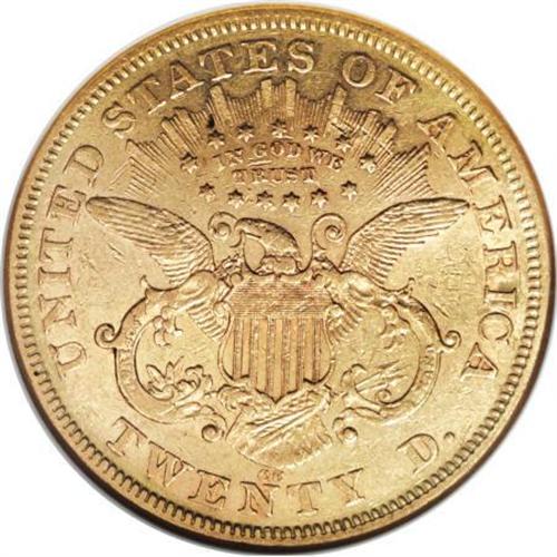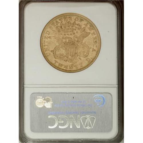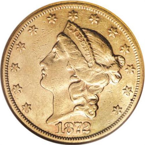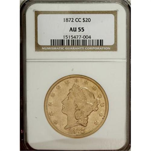 <B>1872-CC $20 AU55 NGC.</B></I> The Carson City Mint struck 26,900 double eagles in 1872. Douglas Winter (2001) estimates that 350 to 400 examples have survived to the present day, with the majority falling into the Very Fine and Extremely Fine grade range. Two to three Mint State coins are thought to exist. While NGC and PCGS have certified about 600 pieces, many of these are probably resubmissions.<BR> This Choice AU specimen displays honey-gold surfaces that retain luster in the recessed areas. The design elements are generally well impressed, except for minor softness in portions of Liberty's hair. As is the case with almost every known 1872-CC twenty, a number of contact marks are scattered about, a bit more so on the obverse.<BR><BR><B>Coin Engraver:</B> James B. Longacre<BR><BR><b>Shipping:</b> Coins & Currency (<a target="_blank" href="http://www.heritageauctions.com/common/shipping.php">view shipping information</a>\)