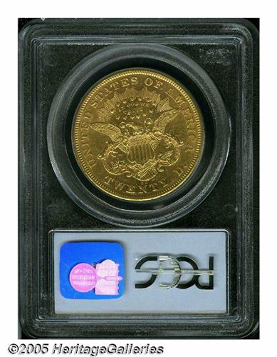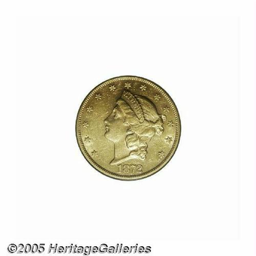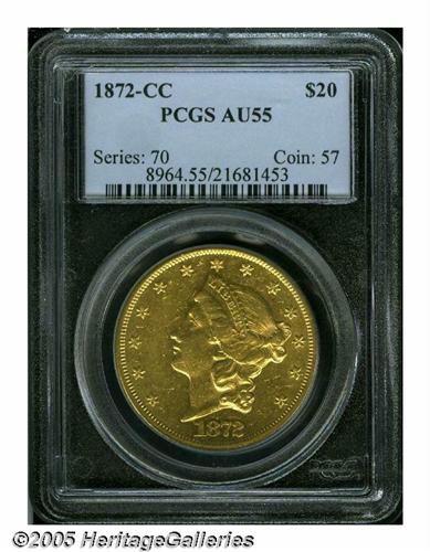 <B>1872-CC<$20> AU55 PCGS.</B></I> The 1872-CC is a scarce and highly respected date in the Carson City series. High grade examples are seldom seen with the average coin in the VF-XF grade range. At the AU55 level, this is not exactly an inexpensive choice for the CC collector, but it is half the price of an MS60 coin with three-quarters (or more) of the eye appeal. Sharply struck, the fields have that "fuzzy" look of a coin that has been lightly handled, but the more protected areas on each side still retain significant portions of original mint luster. Light, numerous abrasions are peppered over each side but none are singularly distracting or worthy of mention.