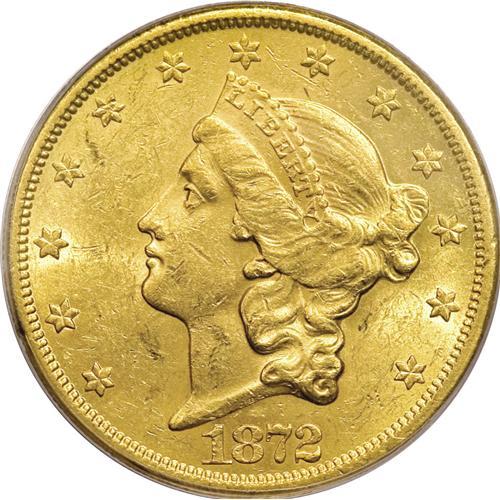 <B>1872-CC $20 AU58 PCGS.</B></I> An amazing piece that ranks as one of the most important double eagles offered in this sale. PCGS has only certified two finer examples of this date, or about one for every 10 years of coin grading. This date is one of the great condition rarities in the Liberty double eagle series. The mintage was 26,900 coins, actually a substantial quantity for the denomination and minting facility. Of course, nearly all of those coins entered circulation at the time, and today only a few have survived in Mint State grades. This frosty piece has excellent surfaces with few marks of any type, and brilliant light yellow-gold luster. Population: 26 in 58, 2 finer (4/07).<BR><BR><b>Shipping:</b> Coins & Currency (<a target="_blank" href="http://www.heritageauctions.com/common/shipping.php">view shipping information</a>)
