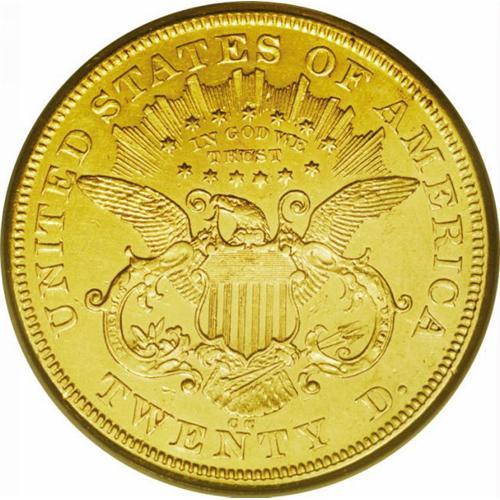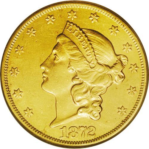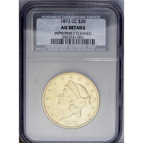 <B>1872-CC<$20>--Improperly Cleaned--NCS. AU Details.</B></I> Variety 1-B, the mintmark is relatively wide. A boldly struck representative of this difficult, early Carson City Type Two issue. Subdued but nearly unblemished to the naked eye, but when viewed beneath a glass, wispy hairlines overlay the tan-gold fields. Just 26,900 pieces were struck.