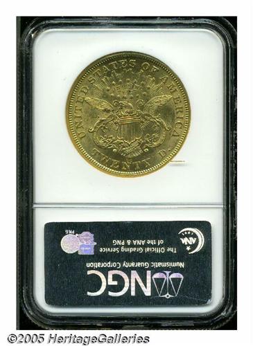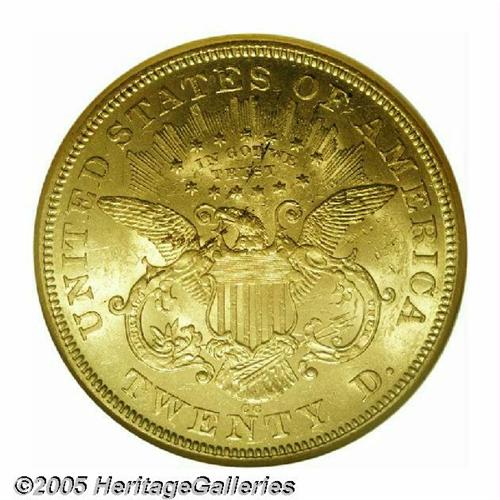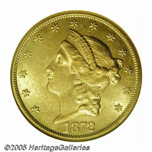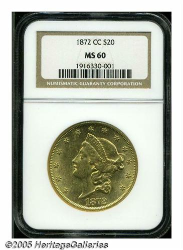 <B>1872-CC<$20> MS60 NGC..</B></I> The 1872-CC is a scarce CC twenty with an original mintage of only 26,900 pieces. It is just a bit more available than the 1870-CC and 1871-CC, and is one of the keys to the CC series. Only a handful of Mint State pieces have been certified, and these are out of reach of all but the most determined collectors. NGC and PCGS have seen a total of just four pieces in MS60, and 13 finer (5/05). This specimen shows bright yellow-gold surfaces with luster in the recessed areas. The design elements are adequately struck. Numerous minute contact marks are scattered about, especially over the obverse.
