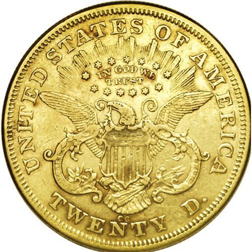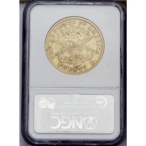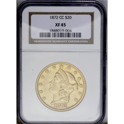 <B>1872-CC<$20> XF45 NGC.</B></I> Variety 1-B. While nowhere near as scarce as the 1871-CC, the 1872-CC still has a relatively low number of survivors with 350-400 believed known today. This particular piece has bright golden-orange surfaces, and like most of the coins from this collection, there are surprisingly few abrasions present for the issue. In fact, the only mentionable mark is a shallow horizontal scratch across the front of Liberty's neck. A bit of mint luster remains around the devices on the reverse, and there is a noticeable trace of russet color present around the devices on each side.<BR><I>Ex: Unknown Hollinbeck Stamp & Coin Co. Auction, lot 1220, flip accompanies.</B></I><BR><I>From The Lewis (Tahoe) Collection.</B></I>