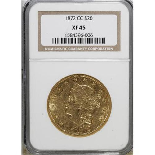 <B>1872-CC $20 XF45 NGC.</B></I> Though the 1872-CC double eagle is far more available than its counterparts from the previous two years, it remains elusive, particularly in better grades. The subtly alloyed wheat-gold fields of this Choice XF coin retain surprisingly strong luster, and though the portrait is softly struck, it shows only modest wear. An arcing abrasion at Liberty's neck and the nearby fields is the only flaw deserving individual mention.<BR><BR><B>Coin Engraver:</B> James B. Longacre<BR><BR><b>Shipping:</b> Coins & Currency (<a target="_blank" href="http://www.heritageauctions.com/common/shipping.php">view shipping information</a>)