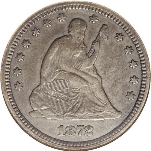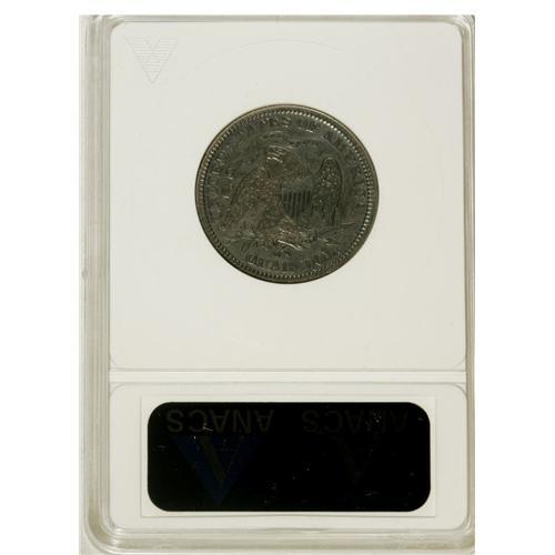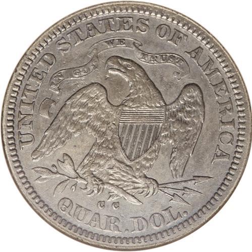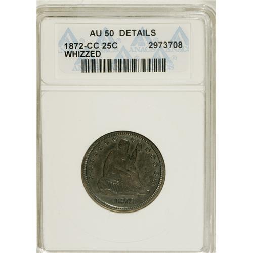 <B>1872-CC 25C --Whizzed--ANACS. AU50 Details.</B></I> The tiny radial lines in the surfaces are the telltale marks of whizzing, but this rare piece retains much appeal nonetheless. This important early Seated quarter issue was produced to the extent of only 22,850 business strikes. The diagonal die scratch in the lower portion of the shield is diagnostic for the single obverse used. Deep smoke-gray toning under a light reveals attractive aqua tints. A few moderate abrasions are noted under the scroll on the reverse and in the right obverse field, but the devices are largely free of distracting abrasions.<BR><BR><b>Shipping:</b> Coins & Currency (<a target="_blank" href="http://www.heritageauctions.com/common/shipping.php">view shipping information</a>)