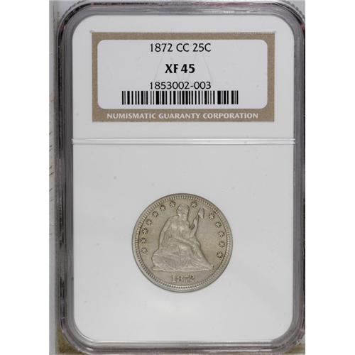 <B>1872-CC 25C XF45 NGC.</B></I> The 1872-CC is rare in all grades, although unlike the other No Arrows Carson City issues, it is collectible in Fine and VF grades. Since no collectors existed in the Old West to pluck Carson City quarters from circulation when they were new, high grade survivors exist only by chance. Just two pieces have been above the AU55 level, an NGC MS66 and a PCGS MS62. Even in XF, the 1872-CC is important, and such pieces are under formidable dual demand from Carson City and Seated quarter specialists. This sharp example shows traces of luster across the devices, and the streaky tan and slate-gray surfaces lack singularly mentionable marks. Census: 2 in 45, 3 finer (10/06).<BR><BR><b>Shipping:</b> Coin/Currency (<a target="_blank" href="http://www.heritageauctions.com/common/shipping.php">view shipping information</a>)