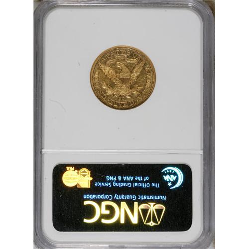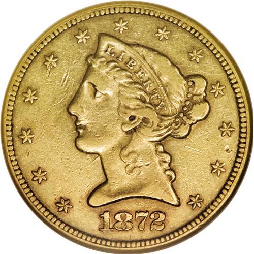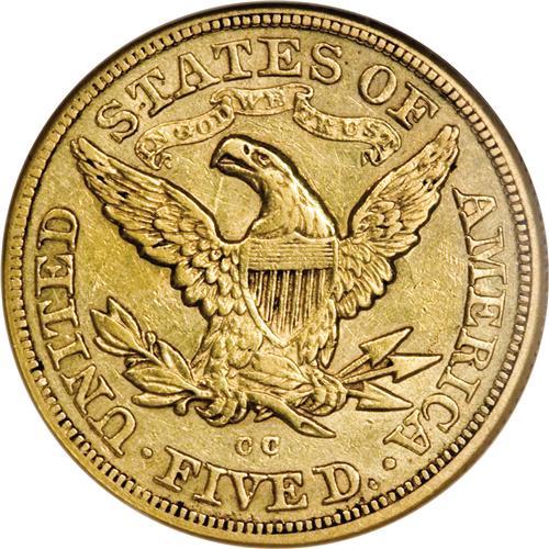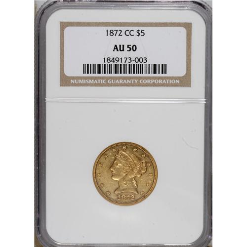 <B>1872-CC $5 AU50 NGC.</B></I> This rare half eagle hails from early in the life of the Carson City Mint, which struck its first coins--the largest three denominations each in gold and silver--only two years before. Precious-metal coinage was desperately needed in the burgeoning West. Establishment of a mint in Nevada allowed the United States to coin silver from Nevada's Comstock Lode, whose production peaked in about 1878, as well as the considerable amounts of gold also mined from the surroundings, without the necessity for the perilous transport to San Francisco.<BR> Rusty Goe's <I>The Mint on Carson Street</B></I> (2003) notes concerning this issue, "At the turn of the 21st century, the 1872-CC is the only date in the Carson City half eagle series that has not had a specimen graded in Mint State condition by either PCGS or NGC. At the top of the Condition Census are two AU-58 specimens (possibly the same coin). Survival percentage estimates for the 1872-CC half eagles are lower than any other date in the series, with less than 0.5% extant." Today, in 2007, those statements are still true, as not a single Mint State example shows at either service. The present piece features light, grade-consistent contact marks, attesting to a short time in circulation, over the khaki-gold surfaces. Considerable luster remains in the protected areas, especially on the reverse, and the strike is surprisingly well executed. Census: 4 in 50, 15 finer (3/07).<BR><BR><b>Shipping:</b> Coins & Currency (<a target="_blank" href="http://www.heritageauctions.com/common/shipping.php">view shipping information</a>)