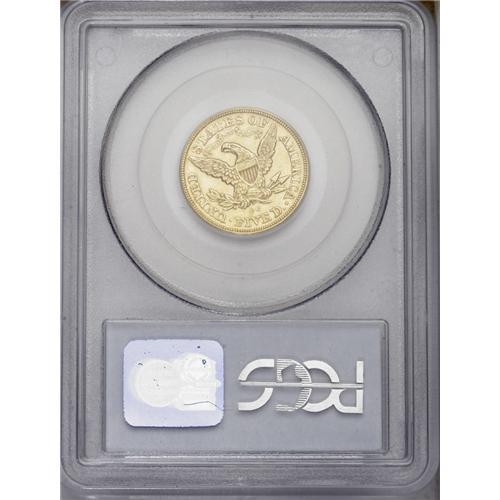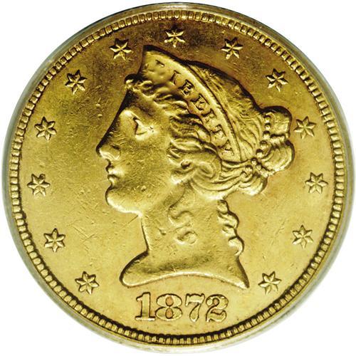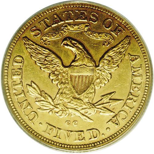 <B>1872-CC<$5> AU55 PCGS.</B></I> The 1872-CC is a very rare issue even though 16,980 pieces were produced. Only 70-80 examples are believed known today; PCGS and NGC have certified fewer than 130 coins, some of which are likely resubmissions. No Mint State specimens have been certified to date.<BR> The Choice AU example presented here displays bright, yellow-gold surfaces, and luster in the recessed areas. The design features are considerably better defined than is usually the case for the issue, which is typically poorly struck in the centers. While some softness is noted in the hair curls around the ear, the remaining hair, as well as the eagle's feathers and shield, display nice detail. A few small contact marks are visible on Liberty's cheek and neck, but the surfaces do not reveal the extensive abrasions seen on most '72-CCs. The most distinctive pedigree identifiers are couple of milling marks on Liberty's neck, and a vertical die break from the eagle's beak to the left (facing) wing. Population: 5 in 55, 1 finer (2/06).