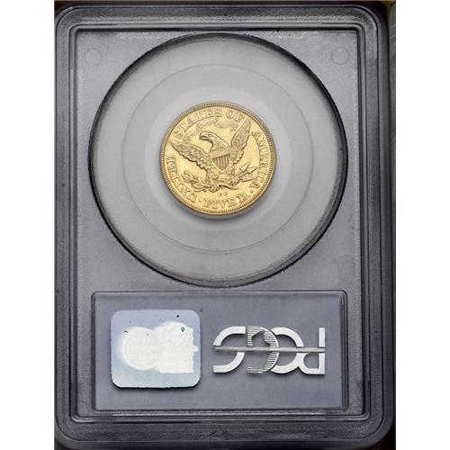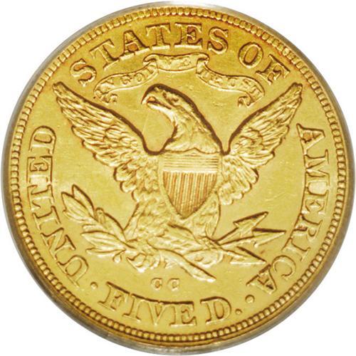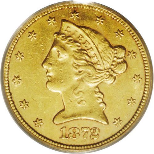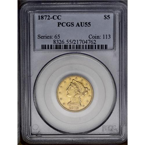 <B>1872-CC $5 AU55 PCGS.</B></I> Winter 1-A. The 1872-CC is a very rare issue even though 16,980 pieces were produced. Only 70-80 examples are believed known today and it is a significant condition rarity with this piece being a mid-Condition Census coin. The surfaces are bright and yellow-gold in color with numerous small abrasions scattered over each side, as usual for this issue. A bit softly defined over the highpoints, as one would expect for a '72-CC, the most distinctive pedigree identifiers are couple of milling marks on Liberty's neck, and a vertical die break from the eagle's beak to the left (facing) wing. Population: 5 in 55, 1 finer (1/06).