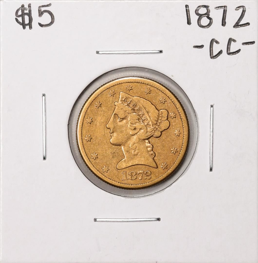 One 1872-CC $5 Liberty Head Half Eagle Gold Coin.