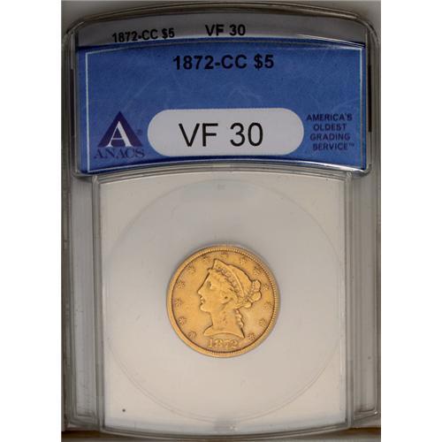 1872-CC $5 VF30 ANACS. With a mintage of only 16,980 p 1872-CC