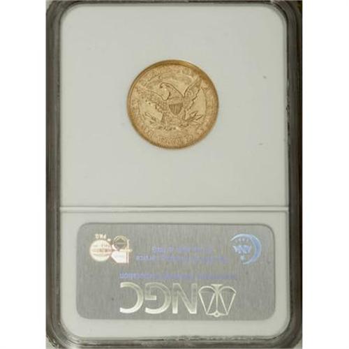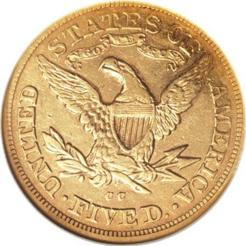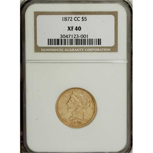 <B>1872-CC $5 XF40 NGC.</B></I> The reverse periphery retains traces of luster, though this issue's typically soft strike is evident on the eagle's neck and the upper portrait. The yellow-gold surfaces are subtly radiant with scattered wispy abrasions. An interesting, lightly circulated half eagle from the early years of the Carson City Mint, highly elusive despite a recorded mintage of 16,980 pieces. Census: 6 in 40, 27 finer (6/07).<BR><BR><B>Coin Engraver:</B> Christian Gobrecht<BR><BR><b>Shipping:</b> Coins & Currency (<a target="_blank" href="http://www.heritageauctions.com/common/shipping.php">view shipping information</a>\)