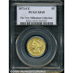 <table><tbody><tr><td><table> <TR><TD width="100%"><TABLE cellSpacing=1 cellPadding=3 width="100%" border=0><TBODY><TR><TD width="100%" bgColor=#79735c><FONT face=arial color=#ffffff size=3><B>Description</B> </FONT></TD></TR><TR><TD width="100%" bgColor=#ffffff><FONT face=arial size=2><B>1872-CC $5 XF45 PCGS.</B></I> Variety 1-A. Just 16,980 examples of the 1872-CC Five Dollar were originally produced. It is elusive in the absolute sense as well as an important condition rarity among Carson City Half Eagles. This piece shows moderate wear as well as typical softness over the highpoints, with much surviving luster in the recesses. Population: 9 in 45, 8 finer (10/03).<BR><I>From The New Millennium Collection, Part 3.</B></I> </FONT></TD></TR></TBODY></TABLE></TD></TR></TBODY></TABLE><BR><A name=PricesRealized></A><TABLE cellSpacing=0 cellPadding=0 width="100%" bgColor=#000000 border=0><TBODY><TR><TD width="100%"><TABLE cellSpacing=1 cellPadding=3 width="100%" border=0><TBODY><TR><TD width="100%" bgColor=#79735c><A name=PR><FONT face=arial color=#ffffff size=3><B>Previous Prices from Heritage Auctions</B> </FONT></A></TD></TR><TR><TD bgColor=#f6f6ed><TABLE cellSpacing=0 cellPadding=0 width="100%" border=1><TBODY><TR><TD align=middle width="33%"><B>Date</B></TD><TD align=middle width="33%"><B>Service</B></TD><TD align=middle width="33%"><B>Price</B></TD></TR><TR bgColor=whitesmoke><TD width="33%"><B>01/04/1995</B></TD><TD width="33%">NGC</TD><TD width="33%">$3,135.00</TD></TR></TBODY></TABLE></TD></TR><TR><TD bgColor=#ffffff><FONT face=arial size=1 ?>PLEASE NOTE: All prices realized reflect the final hammer price PLUS the buyer's premium in auctions that charge a buyer's premium. Each item has a notation at the top of the listing indicating whether that lot included a buyer's premium. Example: A item that sells with a final hammer price of $100 and a 20% buyer's premium will display with a price realized of $120. All information listed is intended to be as accurate as possible, but errors are possible. Please use this guide carefully and inform us of any inaccuracies. </FONT></TD></TR></TBODY></TABLE></TD></TR></TBODY></TABLE><BR><TABLE cellSpacing=0 cellPadding=0 width="100%" bgColor=#000000 border=0><TBODY><TR><TD width="100%"><TABLE cellSpacing=1 cellPadding=3 width="100%" border=0><TBODY><TR><TD width="100%" bgColor=#79735c colSpan=6><FONT face=arial color=#ffffff size=3><B>Price Guide*</B> </FONT></TD></TR><TR bgColor=#f6f6ed><TD align=middle><B>Grade</B> </TD><TD align=middle><B>Coin World<BR>(Trends)</B> </TD><TD align=middle><B>Numismedia<BR>Retail</B> </TD><TD align=middle><B>Numismedia<BR>Wholesale</B> </TD><TD align=middle><B>Coin<BR>Universe</B> </TD><TD align=middle><B>Heritage<BR>Value Index</B> </TD></TR><TR bgColor=#ffffff><TD align=middle>40</TD><TD align=right>$5,250.00</TD><TD align=right>---</TD><TD align=right>$7,190.00</TD><TD align=right>$4,875.00</TD><TD align=right>$3,292.50</TD></TR><TR style="FONT-WEIGHT: bold" bgColor=#cccfdd><TD align=middle>45</TD><TD align=right>$11,500.00</TD><TD align=right>---</TD><TD align=right>---</TD><TD align=right>---</TD><TD align=right>$7,647.50</TD></TR><TR bgColor=#ffffff><TD align=middle>50</TD><TD align=right>$25,000.00</TD><TD align=right>---</TD><TD align=right>$12,750.00</TD><TD align=right>---</TD><TD align=right>$14,525.00</TD></TR><TR bgColor=#ffffff><TD colSpan=6><FONT size=1>*All information listed is intended to be as accurate as possible, but errors are possible. No item may be returned or refused based on this information which is provided as a service to our customers. You should contact each pricing source directly to determine the accuracy of this information. </FONT></TD></TR></TBODY></TABLE></TD></TR></TBODY></TABLE><BR><TABLE cellSpacing=0 cellPadding=0 width="100%" bgColor=#000000 border=0><TBODY><TR><TD width="100%"><TABLE cellSpacing=1 cellPadding=3 width="100%" border=0><TBODY><TR><TD width="100%" bgColor=#79735c><FONT face=arial color=#ffffff size=3><B>Population Guide</B> </FONT></TD></TR><TR bgColor=#ffffff><TD align=middle><!-- Begin Output of Population Grid--><TABLE cellSpacing=0 cellPadding=0 width="100%" border=0><TBODY><TR><TD vAlign=center><TABLE cellSpacing=0 width="100%" border=1 cellsadding="3"><TBODY><TR><TD vAlign=center><TABLE cellSpacing=0 cellPadding=3 width="100%" border=1><TBODY><TR><TD vAlign=center align=middle bgColor=#f0f1e8 colSpan=2 <CENTER><FONT face=Arial size=2><B>PCGS Pop </B></FONT><CENTER></CENTER></TD><TD vAlign=center align=middle bgColor=#f0f1e8 colSpan=2><CENTER><FONT face=Arial size=2><B>NGC Pop</B></CENTER></FONT></TD></TR><TR><TD vAlign=center><FONT face=Arial size=2>(45)</FONT> </TD><TD vAlign=center align=right><FONT face=Arial size=2>9</FONT> </TD><TD vAlign=center><FONT face=Arial size=2>(45)</FONT> </TD><TD vAlign=center align=right><FONT face=Arial size=2>10</FONT> </TD></TR><TR><TD vAlign=center><FONT face=Arial size=2>(>45)</FONT> </TD><TD vAlign=center align=right><FONT face=Arial size=2>8</FONT> </TD><TD vAlign=center><FONT face=Arial size=2>(>45)</FONT> </TD><TD vAlign=center align=right><FONT face=Arial size=2>8</FONT> </TD></TR></TBODY></TABLE></TD></TR></TBODY></TABLE></TD></TR></TBODY></TABLE><!-- End Output of Population Grid--></TD></TR></TBODY></TABLE></TD></TR></TBODY></TABLE><BR><TABLE cellSpacing=0 cellPadding=0 width="100%" bgColor=#000000 border=0><TBODY><TR> <font color='#000000'><span style='background-color: #FFFFFF'><td bgcolor='#FFFFFE'> Important notice: Heritage usually auctions material at the rate of 200-250 lots per hour. On some occasions eBay Live bid software or the Internet may not be able to keep up with the pace of the auction. We recommend placing a realistic absentee bid now as insurance to avoid disappointment. Occasionally the auctioneer may eliminate or reject an eBay Live bid, and the auctioneer may also reopen a lot after the close of the eBay live bidding (usually because we missed an audience bid), and may reject your bid