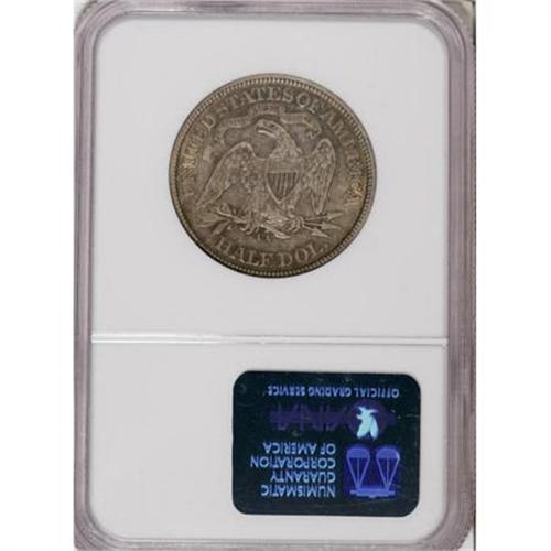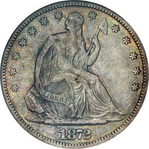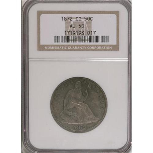 <B>1872-CC 50C AU50 NGC.</B></I> Traces of golden luster remain in the most protected areas and the color is a pleasing and consistent blend of olive-gold and rich bronze. Although the issue's mintage of 257,000 pieces is comparatively high for Carson City, heavy contemporary demand in the region has left few minimally worn survivors for today's collector. An attractive and problem-free example. Census: 3 in 50, 8 finer (11/07).<BR><BR><B>Coin Engraver:</B> Christian Gobrecht<BR><BR><b>Shipping:</b> Coins & Currency (<a target="_blank" href="http://www.heritageauctions.com/common/shipping.php">view shipping information</a>)