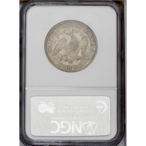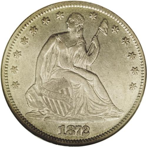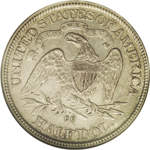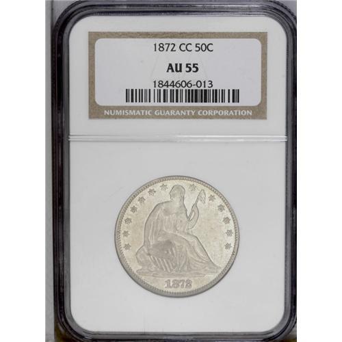 <B>1872-CC<50C> AU55 NGC.</B></I> The 1872-CC does not have a particularly low mintage for an early Carson City issue, but survivors are scarce in any grade, and NGC has yet to certify a Mint State example. This bold dove-gray piece has only a few small marks on the right obverse field. Liberty has partial drapery beneath her elbow. Census: 3 in 55, 1 finer (2/06).