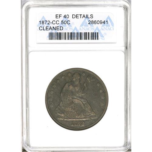 <B>1872-CC<50C>--Cleaned--ANACS. XF40 Details.</B></I> Deeply toned in blended lilac and sea-green swaths. Hairlines are not evident through the dusky patina. LIBERTY is fully legible, although the E is faint. Liberty's chest and knee exhibit wear. Rare in higher circulated grades despite a reasonable mintage.