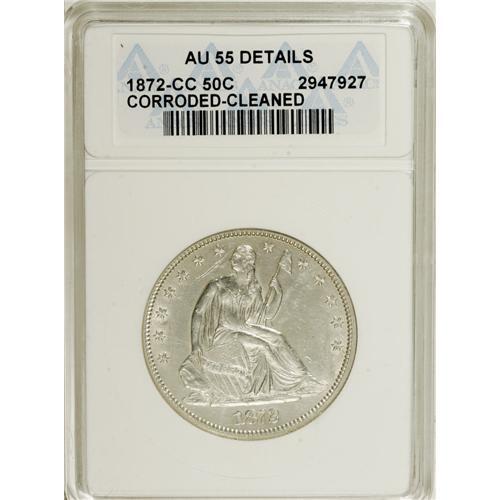 <B>1872-CC 50C --Corroded, Cleaned--ANACS. AU55 Details.</B></I> This lightly wiped Carson City half has a few small patches of granular surface on the right obverse field, and the reverse is slightly granular on the shield and above the eagle's shoulders. A scratch is noted beneath stars 6 and 7.<BR><I>From The Reginald Byron Mason Collection.</B></I><BR><BR><b>Shipping:</b> Coins & Currency (<a target="_blank" href="http://www.heritageauctions.com/common/shipping.php">view shipping information</a>)