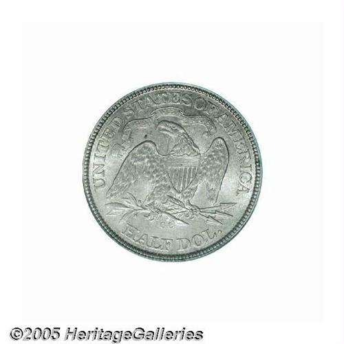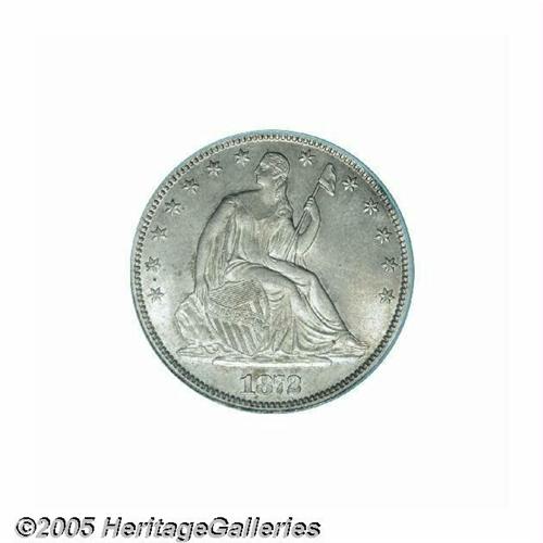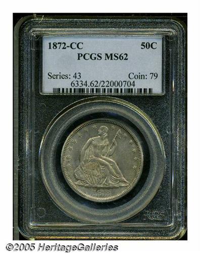 <B>1872-CC<50C> MS62 PCGS.</B></I> The 1872-CC Half Dollar is slightly more available than the 1871-CC. These dates become fairly similar in rarity at the About Uncirculated level, but in full Mint State, the 1872-CC appears to be slightly scarcer. In fact, the presently offered coin is tied with just one other at PCGS as the finest known example (6/05).<BR> Medium gray-golden toning can be seen on both sides of this exceptionally smooth specimen. The strike is unusually sharp for the date; in fact, this is probably the most sharply struck example of this issue we have seen. The underlying surfaces are lustrous and have the semi-matte finish that is typical of this issue. Succinctly put, this is an amazing coin and could be easily the finest known.