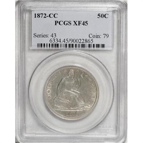 <B>1872-CC 50C XF45 PCGS.</B></I> This early Carson City's mintage of 257,000 pieces is comparatively high for the Nevada facility, but heavy 19th century demand in the region has left few minimally worn survivors for today's collector. This example is a bright silver-gray with only a few scattered field marks. Population: 11 in 45, 21 finer (7/07). <BR><BR><B>Coin Engraver:</B> Christian Gobrecht<BR><BR><b>Shipping:</b> Coins & Currency (<a target="_blank" href="http://www.heritageauctions.com/common/shipping.php">view shipping information</a>\)