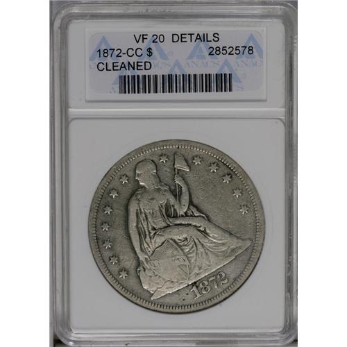 <B>1872-CC<img border='0' src='http://www.heritagecoins.com/images/star.gif' width=10 height=10>$1>--Cleaned--ANACS. VF20 Details.</B></I> The BE in LIBERTY is worn, but IN GOD WE TRUST is clear, as is much of the eagle's plumage. Extensively hairlined on the obverse. The reverse is also hairlined, but less severely. A rare date with a mintage of 3,150 pieces.