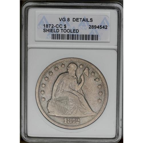 <B>1872-CC<img border='0' src='http://www.heritagecoins.com/images/star.gif' width=10 height=10>$1>--Shield Tooled--ANACS. VG8 Details.</B></I> LIBERTY is sharp on this rare Carson City dollar, but it has had some help, since the obverse shield is completely (and skillfully) re-engraved. No other design elements have been tampered with. IN GOD WE TRUST is nearly fully present. A mere 3,150 pieces were struck.<BR><I>From The Catfish Creek Collection, Part Two.</B></I>