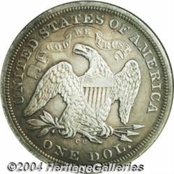<B>1872-CC<S$1>--Tooled, Whizzed--ANACS. XF Details, Net VF20.</B></I> A very rare Carson City date with a mintage of only 3,150 pieces. Bowers estimates that between 145 and 220 pieces have survived in all grades. This specimen is toned light to medium-gray in the fields, with the design elements being a lighter silver-gray. Minor obverse rim nicks are apparent between about 2 and 4 o'clock, and 7 and 9 o'clock. Numerous micro punches are seen in the right and left obverse fields, and several small to moderate abrasions occur on Liberty and the shield. The reverse is relatively clean, save for tooling marks in the upper fields. About one half of the stars show partial central detail. The letters LIRTY of LIBERTY on the obverse shield ribbon are strong, with the BE showing only partial definition. The motto on the reverse ribbon is bold.<BR><I>From The Paulsboro Collection, Part Two.</B></I> <BR><BR><B>Important notice:</B> Heritage usually auctions material at the rate of 200-250 lots per hour. On some occasions eBay Live bid software or the Internet may not be able to keep up with the pace of the auction. We recommend placing a realistic absentee bid now as insurance to avoid disappointment. Occasionally the auctioneer may eliminate or reject an eBay Live bid, and the auctioneer may also reopen a lot after the close of the eBay live bidding (usually because we missed an audience bid), and may reject your bid even if it shows you as the winning bidder. By bidding via eBay Live, you agree that Heritage may award the lot to another bidder at its sole discretion under the circumstances described above or any other reasonable circumstances. Since eBay bids are not shown to us until we open the lot on the floor, we treat those bids just like floor bids. In most cases the floor responds before the eBay bid is presented to us, due to Internet lag time, so for consistency we have made it a policy that floor bids are always considered first over tie eBay live bids. Also please note that all Heritage lots purchased through eBay Live carry a 20% Buyer's Premium. Please make sure you read the Terms and Conditions before you bid. </span></font></tr></table></td></tr></table>