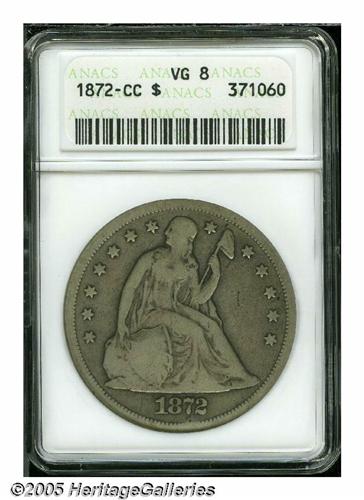 <B>1872-CC<S$1> VG8 ANACS.</B></I> A stone-gray example with relatively unmarked surfaces given its lengthy circulation. The eagle retains much plumage detail, and the outer two letters in LIBERTY are present. The 1871-CC to 1873-CC issues are the rarest Carson City Silver Dollars, and provide good value compared to the more promoted 1889-CC Dollar. Just 3,150 pieces were minted.<BR><I>From The Stig Ericsson Collection.</B></I>
