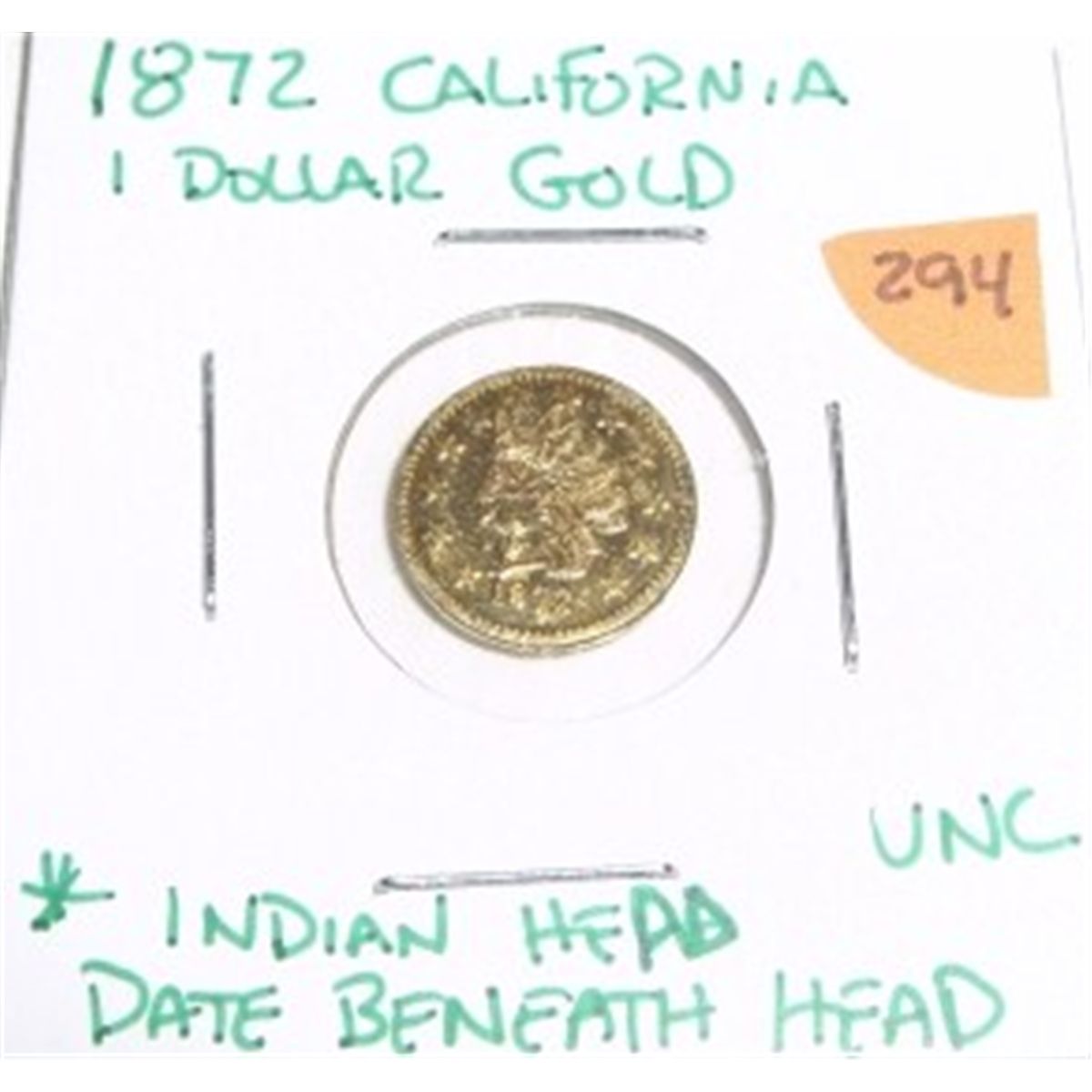1872 California Gold AUNTHENTIC *EXTREMELY RARE 1 DOLLAR INDIAN HEAD-DATE BENEATH HEAD UNC CONDITION*!! ***Coin & Currency Grades, Conditions and Values are not Northern Colorado Estate Liquidators Responsibilty. Grades, Conditions and Values are determined by Consigner(s) & Buyers ONLY***