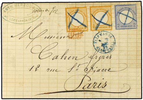 1872 Envelope to FRANCE written from LOGELBACH bearing 1/2 g orange (2) (SG 3) and 2 g blue (SG 20) sent unstamped with French entry cachet in blue and boxed PD tying 1/2 gr, and crayon cancel applied on arrival. Unusual item.