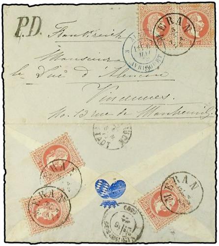 1872 Envelope to PARIS bearing Franz Joseph (coarse beard) 5 Kr red (Yv 34) paying 25 Kr rate tied by MERAN cds handstruck P.D. and French entry cachet with receiving on reverse. Unusual choice of franking.