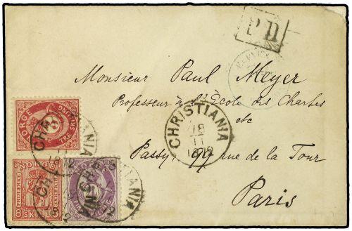 1872 Envelope to Paris with mixed franking of 8 skill. "Lion" + 3sk. & 4sk. "Posthorns" tied by Christiania date stamp.