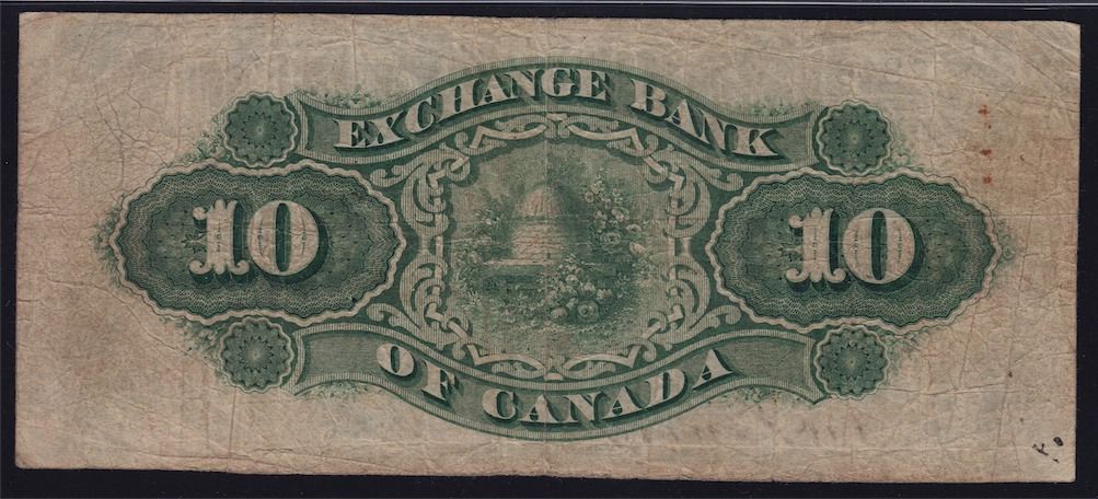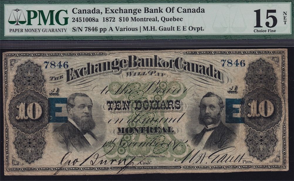 1872 Exchange Bank of Canada $10 - CH 245-10-08a EE Over print. PMG Choice Fine 15. S/N:7846/A.