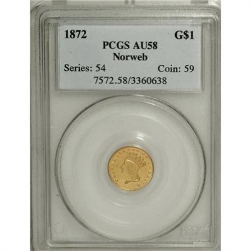 <B>1872 G$1 AU58 PCGS.</B></I> Ex: Norweb. PCGS Population (9/48). NGC Census: (13/44). Mintage: 3,500. Numismedia Wsl. Price for NGC/PCGS coin in AU58: $725. (#7572)<BR><BR><B>Coin Engraver:</B> James B. Longacre<BR><BR><b>Shipping:</b> Coins & Currency (<a target="_blank" href="http://www.heritageauctions.com/common/shipping.php">view shipping information</a>\)