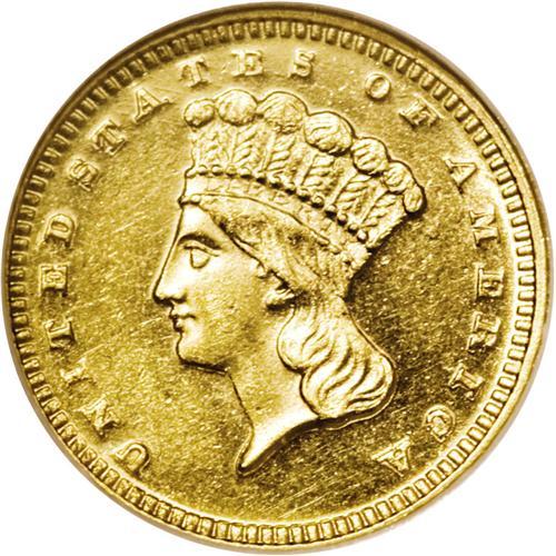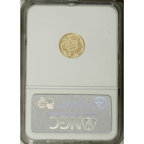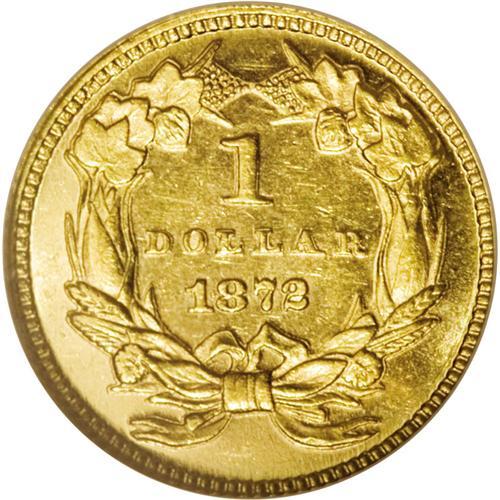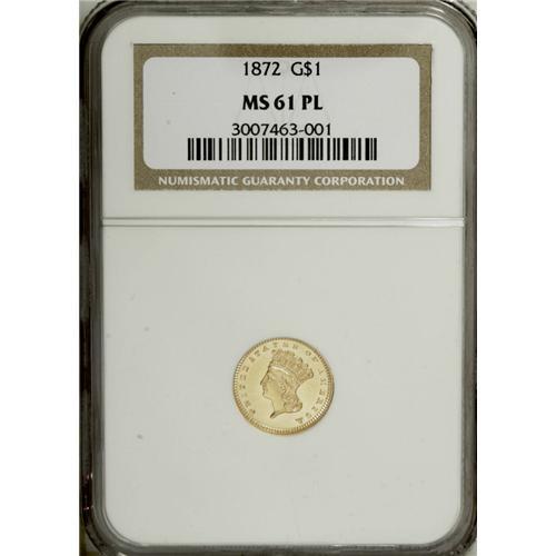 <B>1872 G$1 MS61 Prooflike NGC.</B></I> A flashy and precisely struck gold piece with frosty motifs and surprisingly clean fields. Unlike the 1873 Open 3, the 1872 is scarce. A mere 3,500 pieces were struck, and unlike later low mintage dates, relatively few were set aside by local dealers. Census: 2 in 61 Prooflike, 5 finer (12/06).<BR><BR><b>Shipping:</b> Coin/Currency (<a target="_blank" href="http://www.heritageauctions.com/common/shipping.php">view shipping information</a>)