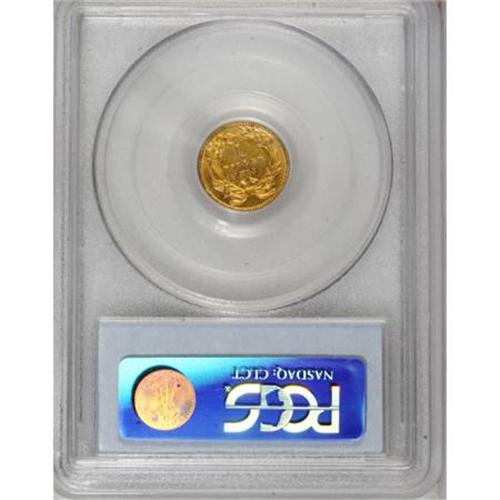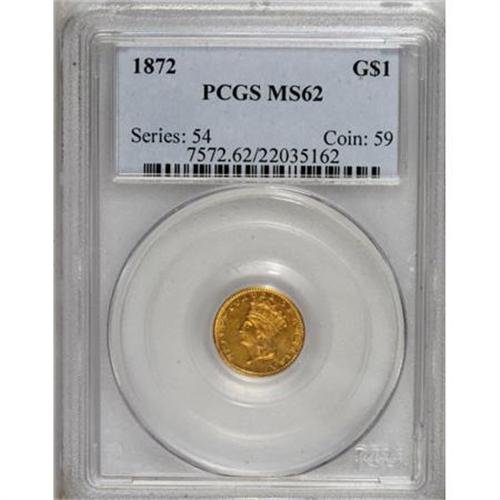 <B>1872 G$1 MS62 PCGS.</B></I> A gleaming butter-yellow example of this low-mintage gold dollar issue, one of only 3,500 pieces struck. Boldly impressed with scattered marks and abrasions that account for the grade, as well as a shallow semicircular depression on the portrait.<BR><BR><B>Coin Engraver:</B> James B. Longacre<BR><BR><b>Shipping:</b> Coins & Currency (<a target="_blank" href="http://www.heritageauctions.com/common/shipping.php">view shipping information</a>)