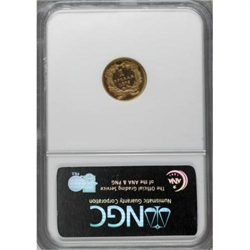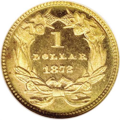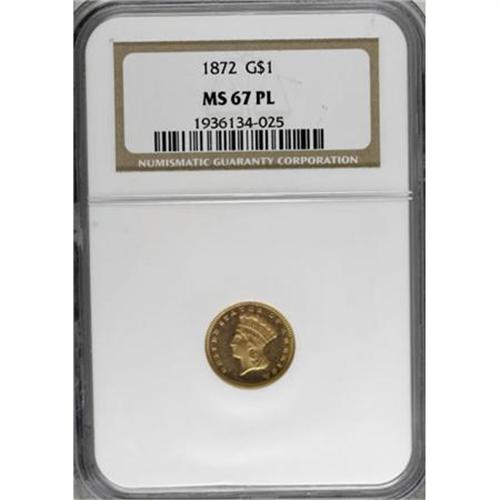 <B>1872 G$1 MS67 Prooflike NGC.</B></I> It ranks as one of the five finest certified by NGC, and one of the two finest prooflike pieces graded by the firm. Undoubtedly a business strike, yet with the outward appearance of a Superb Cameo proof, this piece will easily delight the connoisseur of the highest quality gold pieces. Every detail is bold with full prooflike surfaces around the frosty devices. Rich yellow color is enhanced by wisps of pink toning. The reverse shows a single splash of orange toning.<BR> Just 3,500 business strikes were minted, and pieces are rarely encountered today. Jeff Garrett and Ron Guth note that the "date is sporadically offered for sale." Later in the same paragraph of their <I>Encyclopedia of U.S. Gold Coins</B></I>, they compare rarity and price: "given the date's scarcity, prices for the issue seem undervalued at current levels." Census: 1 in 67 Prooflike, 1 finer (6/07).<BR><BR><B>Coin Engraver:</B> James B. Longacre<BR><BR><b>Shipping:</b> Coins & Currency (<a target="_blank" href="http://www.heritageauctions.com/common/shipping.php">view shipping information</a>\)