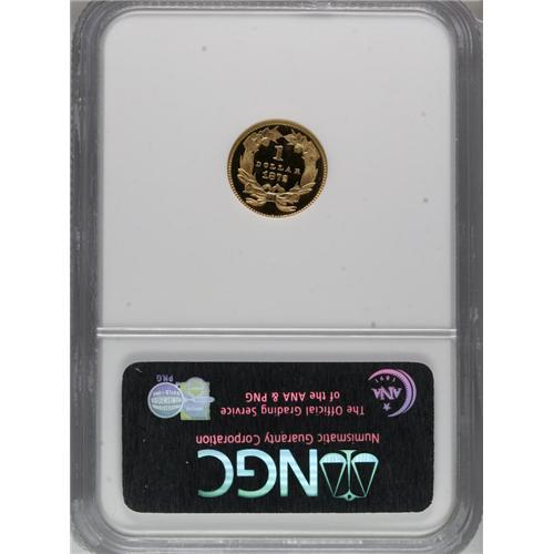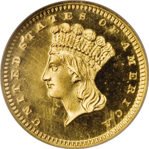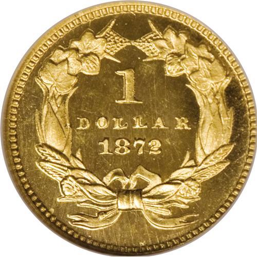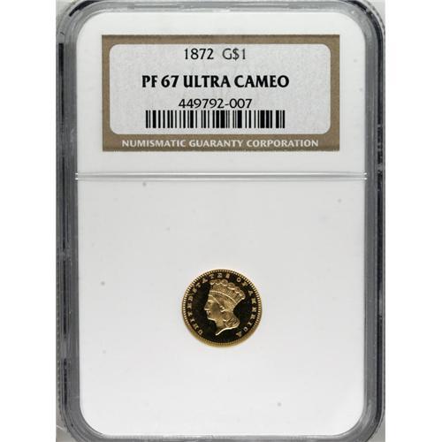 <B>1872 G$1 PR67 Ultra Cameo NGC.</B></I> The 1872 One dollar proof shows a mintage of 30 pieces. Jeff Garrett and Ron Guth, in their <I>Encyclopedia of U.S. Gold Coins, 1795-1933,</B></I> write: "More 1872 coins have been offered for sale that others of the series with mintages of less than 50. The 1872 gold dollar is another date that appears to have a survival rate greater than the original mintage. When studying the rarity of any gold coin, the population date can be very misleading. It is very common for a rare coin to have been resubmitted multiple times in search of a higher grade. this can mean thousands of dollars on some coins, and dealers and collectors can be persistent."<BR><BR> Garrett and Guth suggest that no more than 20 proof 1872 dollars have survived; Walter Breen, writing in his <I>Complete Encyclopedia of U.S. and Colonial Coins,</B></I> estimates 13 to 17 pieces are extant. PCGS and NGC have seen a total of 10 proofs to date, seven Cameo proofs, and seven "Deep/Ultra Cameo" examples.<BR><BR> The light yellow-gold surfaces of the current PR67 Ultra Cameo display astonishing gold-on-black contrast. The design elements are exquisitely brought up, and impart bold definition to the bonnet, the letters of LIBERTY, the hair, and to the intricacies of the reverse wreath. Some die polish lines are noted in the fields of each side, and a minor planchet defect to the upper right of the first S in STATES may help to identify the coin. A couple of faint linear marks at the upper part of Liberty's head are mentioned for accuracy. Census: 3 in 67 Ultra Cameo, 0 finer (4/07).<BR><BR><b>Shipping:</b> Coins & Currency (<a target="_blank" href="http://www.heritageauctions.com/common/shipping.php">view shipping information</a>)
