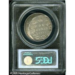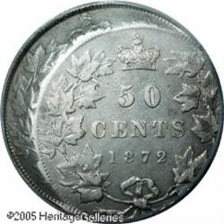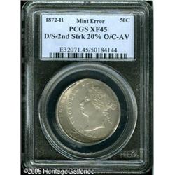 <B>1872-H 50C Inverted A Canada 50 Cents--Double Strike, Second Strike 20% Off Center--XF45 PCGS.</B></I> Unlike coins of the United States, errors on Canadian coinage are few and far between, especially among the 19th century issues. In fact, a review of our Auction Archives reveals that the only other 19th century Canadian error coin that we have handled in the past 12 years was an off-center 1859 cent. The rarity of this error is especially important given that it was struck at England's Heaton Mint, where quality control was much further advanced than it is at other coinage facilities.<BR> This amazing error fifty cent piece was struck once, normally centered, and then struck a second time, 20% off center at 2 o'clock. The entire date is visible on the second strike. As the Heaton Mint was the only location for coinage of fifty cent pieces in 1872, the specific issue is positively identified. Further, this is the variety with the V in VICTORIA created by an inverted A punch, a rare variety in its own right. The surfaces are pale gray, just as they should be, with wisps of pale gold toning, especially near the borders. A few faint scratches on the surfaces are presumably the result of handling over the years, from past curators sharing this coin with others. There are no individual distracting marks to describe. This double strike is dished upwards on the obverse, at the junction of the two impressions from the coinage press, a characteristic common to all double strikes (except those where someone attempted to straighten the resultant bend in the flan). All of the characteristics and the overall appearance of this numismatic treasure are as they should be.<BR> Accompanied by an old card from a former owner, with a useful description:<BR> "Canada half dollar of 1872. This coin bears the 'H' mint mark, signifying that it was struck at the Heaton mint in England, whereby their report states 80,000 pieces were minted. Of this amount, very few have an inverted 'A' which was mistakenly used as the 'V' in the letters. This coin is a double strike, in that it received the regular strike & another strike as it was being ejected! It not only escaped the inspections, but was allowed to be bagged & shipped. A very astute person noticed this rarity & saved it, for which we are to be thankful, as we are the recipients. It may even be unique, as no one I know, nor myself, have ever seen one like this with the date intact!" Lot:11042
