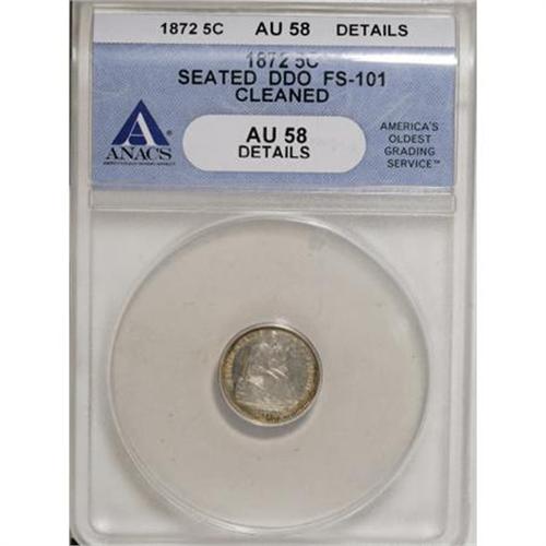 <B>1872 H10C Double Die Obverse--Cleaned--ANACS AU58 Details.</B></I> FS-101. NGC Census: (35/243). PCGS Population (44/233). Mintage: 2,947,950. Numismedia Wsl. Price for NGC/PCGS coin in AU58: $78. (#4400)<BR><I>From The Al Blythe Collection of Half Dimes.</B></I><BR><BR><B>Coin Engraver:</B> Christian Gobrecht<BR><BR><b>Shipping:</b> Coins & Currency (<a target="_blank" href="http://www.heritageauctions.com/common/shipping.php">view shipping information</a>)