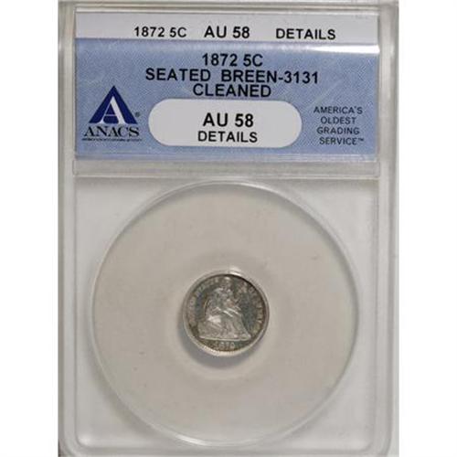 <B>1872 H10C --Cleaned--ANACS AU58 Details.</B></I> Breen-3131. NGC Census: (35/243). PCGS Population (44/233). Mintage: 2,947,950. Numismedia Wsl. Price for NGC/PCGS coin in AU58: $78. (#4400)<BR><I>From The Al Blythe Collection of Half Dimes.</B></I><BR><BR><B>Coin Engraver:</B> Christian Gobrecht<BR><BR><b>Shipping:</b> Coins & Currency (<a target="_blank" href="http://www.heritageauctions.com/common/shipping.php">view shipping information</a>)