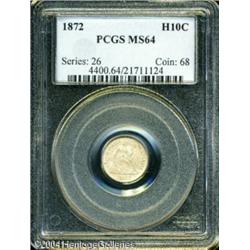 1872 H10C MS64 PCGS. Tan and dove-gray patina bath <B>1872 H10C MS64 PCGS.</B></I> Tan and dove-gray patina bathes this satiny and virtually unabraded near-Gem. The base of the shield and the opposite portion of the wreath are typically struck, but the remainder of the designs are crisp. Population: 49 in 64, 26 finer (11/04). <BR><BR><B>Important notice:</B> Heritage usually auctions material at the rate of 200-250 lots per hour. On some occasions eBay Live bid software or the Internet may not be able to keep up with the pace of the auction. We recommend placing a realistic absentee bid now as insurance to avoid disappointment. Occasionally the auctioneer may eliminate or reject an eBay Live bid, and the auctioneer may also reopen a lot after the close of the eBay live bidding (usually because we missed an audience bid), and may reject your bid even if it shows you as the winning bidder. By bidding via eBay Live, you agree that Heritage may award the lot to another bidder at its sole discretion under the circumstances described above or any other reasonable circumstances. Since eBay bids are not shown to us until we open the lot on the floor, we treat those bids just like floor bids. In most cases the floor responds before the eBay bid is presented to us, due to Internet lag time, so for consistency we have made it a policy that floor bids are always considered first over tie eBay live bids. Also please note that all Heritage lots purchased through eBay Live carry a 20% Buyer's Premium. Please make sure you read the Terms and Conditions before you bid. This lot is being auctioned in conjunction with a live floor auction by Heritage Galleries & Auctioneers. All final auction and invoice information will be supplied by Heritage Galleries & Auctioneers, and all other information should be considered preliminary. Lot:5692