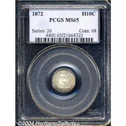 <B>1872<H10C> MS65 PCGS.</B></I> Lustrous silver-gray surfaces exhibit cobalt-blue and reddish-brown toning on the lower obverse. Well struck, with a few small ticks noted in the lower right obverse field. Population: 19 in 65, 7 finer (8/04). <BR><BR><B>Important notice:</B> Heritage usually auctions material at the rate of 200-250 lots per hour. On some occasions eBay Live bid software or the Internet may not be able to keep up with the pace of the auction. We recommend placing a realistic absentee bid now as insurance to avoid disappointment. Occasionally the auctioneer may eliminate or reject an eBay Live bid, and the auctioneer may also reopen a lot after the close of the eBay live bidding (usually because we missed an audience bid), and may reject your bid even if it shows you as the winning bidder. By bidding via eBay Live, you agree that Heritage may award the lot to another bidder at its sole discretion under the circumstances described above or any other reasonable circumstances. Since eBay bids are not shown to us until we open the lot on the floor, we treat those bids just like floor bids. In most cases the floor responds before the eBay bid is presented to us, due to Internet lag time, so for consistency we have made it a policy that floor bids are always considered first over tie eBay live bids. Also please note that all Heritage lots purchased through eBay Live carry a 20% Buyer's Premium. Please make sure you read the Terms and Conditions before you bid.