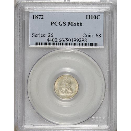 <B>1872 H10C MS66 PCGS.</B></I> A sharply struck and frosty silver-gray example that exhibits delightful golden-tan patina at the margins. Though Philadelphia struck 2,947,000 half dimes in 1872, that Mint's production of nickels was double the half dime mintage, and the silver denomination would meet its end one year later. PCGS has certified no higher-graded examples (4/07).<BR><BR><b>Shipping:</b> Coins & Currency (<a target="_blank" href="http://www.heritageauctions.com/common/shipping.php">view shipping information</a>)