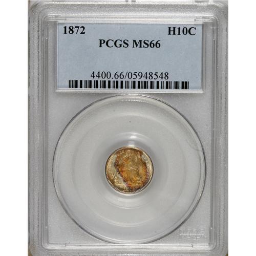 <B>1872 H10C MS66 PCGS.</B></I> Central orange-gold toning is framed by ruby-red and ocean-blue. A lustrous high grade dime with minor incompleteness of strike on the bowknot and an upper left portion of the wreath. Population: 9 in 66, 0 finer (2/07).<BR><BR><b>Shipping:</b> Coins & Currency (<a target="_blank" href="http://www.heritageauctions.com/common/shipping.php">view shipping information</a>)