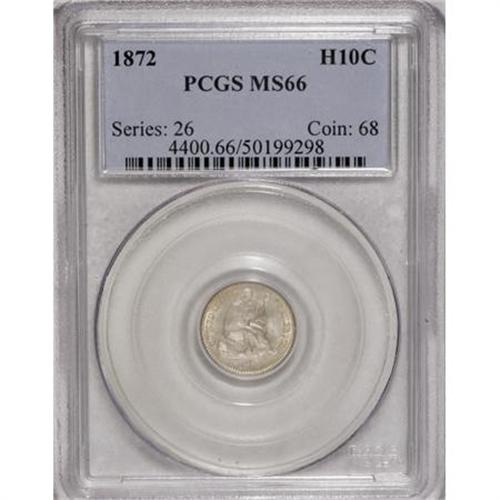 <B>1872 H10C MS66 PCGS.</B></I> A sharply struck and frosty silver-gray example that exhibits delightful golden-tan patina at the margins. Though Philadelphia struck 2,947,000 half dimes in 1872, that Mint's production of nickels was double the half dime mintage, and the silver denomination would meet its end one year later. Tied for the finest certified by PCGS (2/08).<BR><BR><B>Coin Engraver:</B> Christian Gobrecht<BR><BR><b>Shipping:</b> Coins & Currency (<a target="_blank" href="http://www.heritageauctions.com/common/shipping.php">view shipping information</a>)