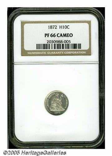 <B>1872<H10C> PR66 Cameo NGC.</B></I> A popular type coin with collectors, only 950 proofs were struck of this late-date issue. This is a bright, flashy proof that is brilliant throughout. The fields are deeply mirrored and the heavily frosted devices provide a strong two-toned cameo contrast. Population: 8 in 66, 1 finer (4/05).