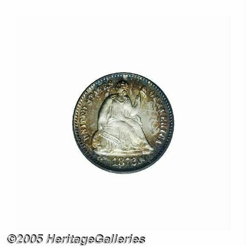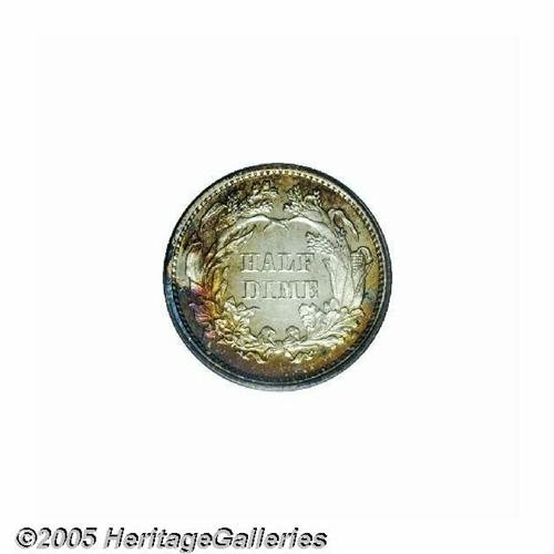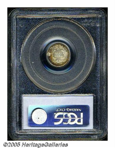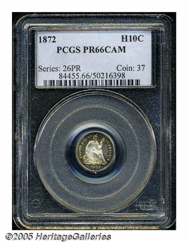 <B>1872<H10C> PR66 Cameo PCGS.</B></I> The moderately toned surfaces display glassy fields and nicely frosted devices. Deep, mottled golden-russet, crimson, and blue toning decorates the borders. Both sides are free of noticeable hairlines, and the strike is razor sharp throughout. The penultimate proof issue of this small silver denomination, the 1872 is a popular issue among high quality type collectors. Population: 1 in 66 Cameo, 0 finer (6/05).